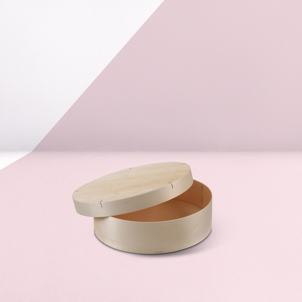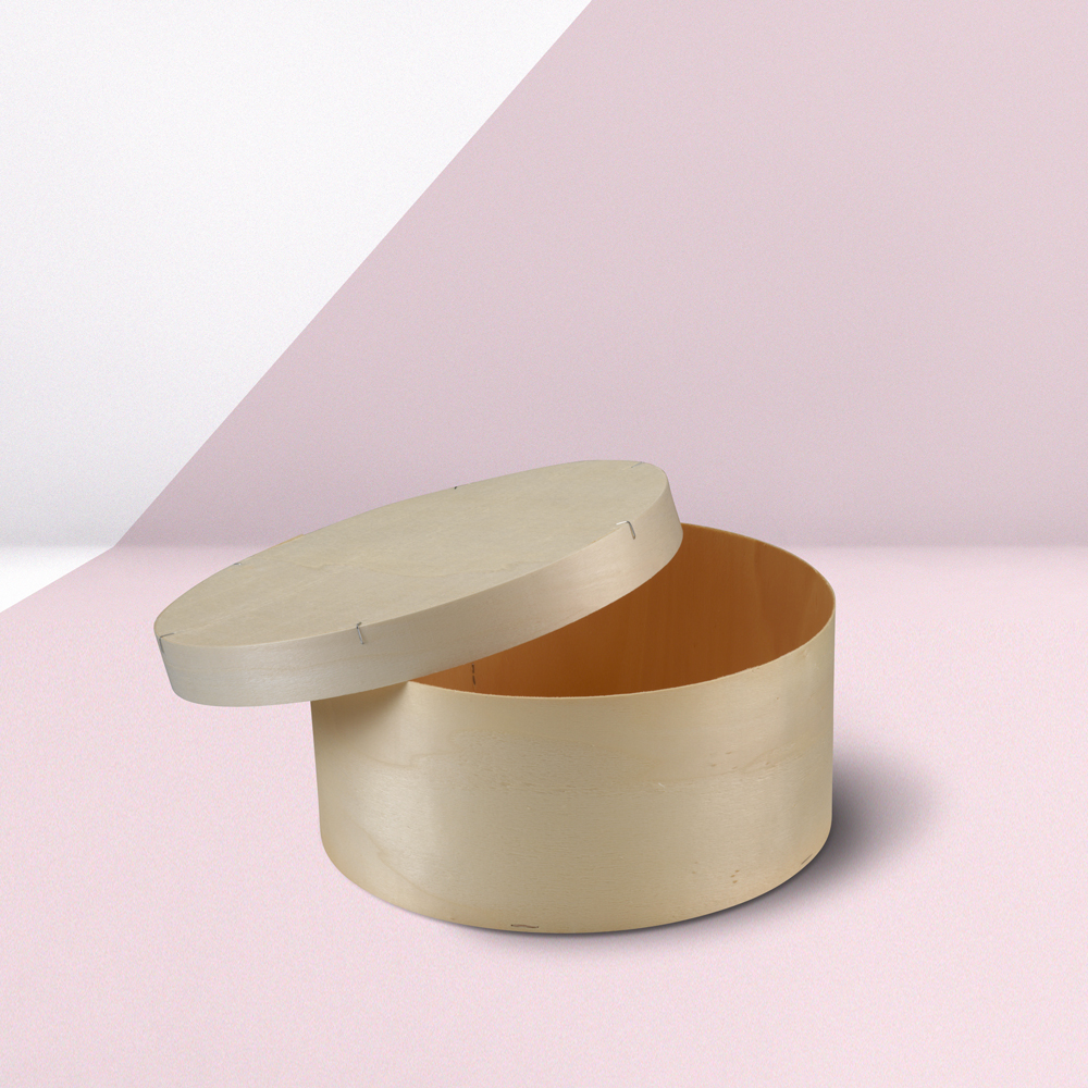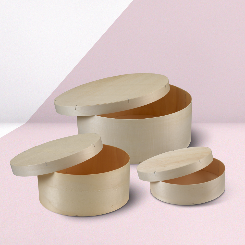 Tris di scatole a cappelliera in legno perfette come imballaggi per alimenti e oggetti di vario genere. Personalizzabili con logo.
